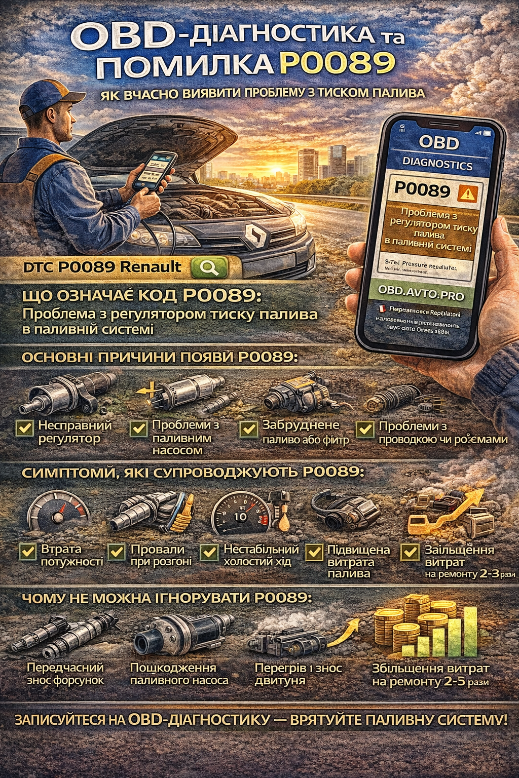Особливо часто цей код зустрічається на автомобілях із системами Common Rail та прямим уприскуванням. У власників Renault він відомий як DTC P0089 Renault, і зазвичай сигналізує про нестабільну або неправильну роботу регулятора тиску пального в паливній рампі. Коли тиск палива не відповідає заданим параметрам, двигун починає працювати нестабільно, втрачає потужність і може переходити в аварійний режим.