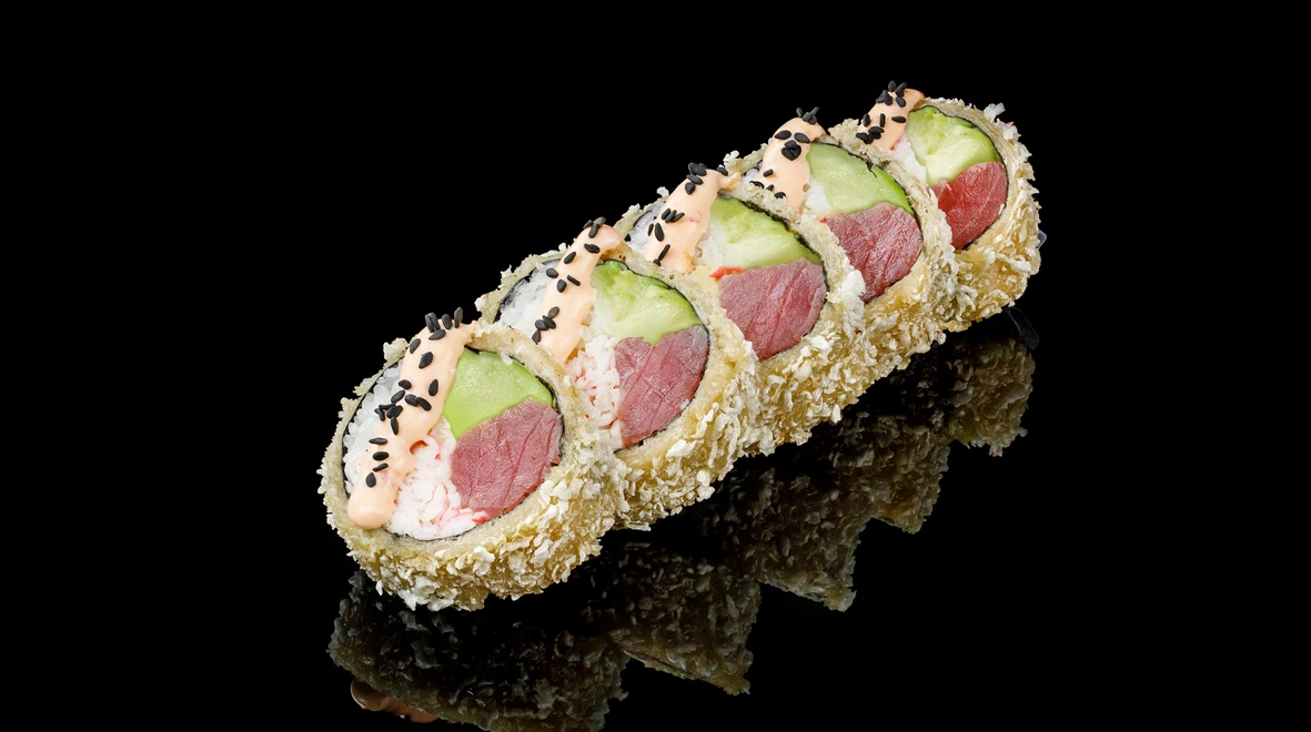 - Темпура рол з тунцем — гармонія ніжного тунця та хрусткої скоринки, що додає страві виразності.